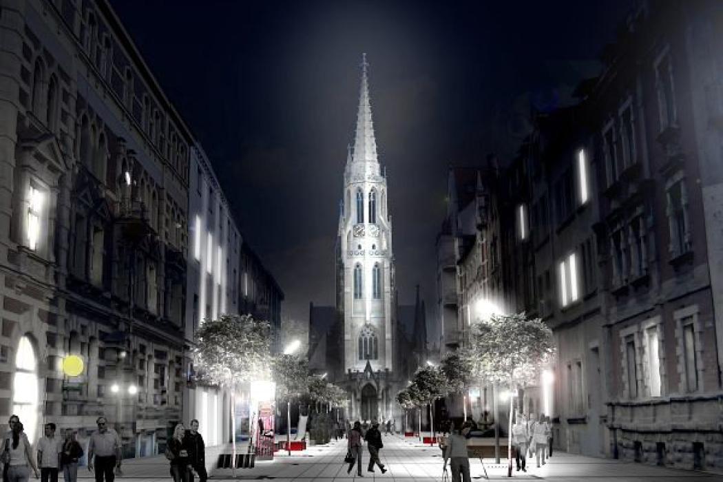 Atrakcją tej przestrzeni publicznej jest wydobycie perspektywicznego zamknięcia wieżą Kościoła Mariackiego