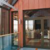 Kubaturę nową od istniejącej oddziela całkowicie przeszklona kładka wejścia. Elewację i stropodach kształtuje blacha